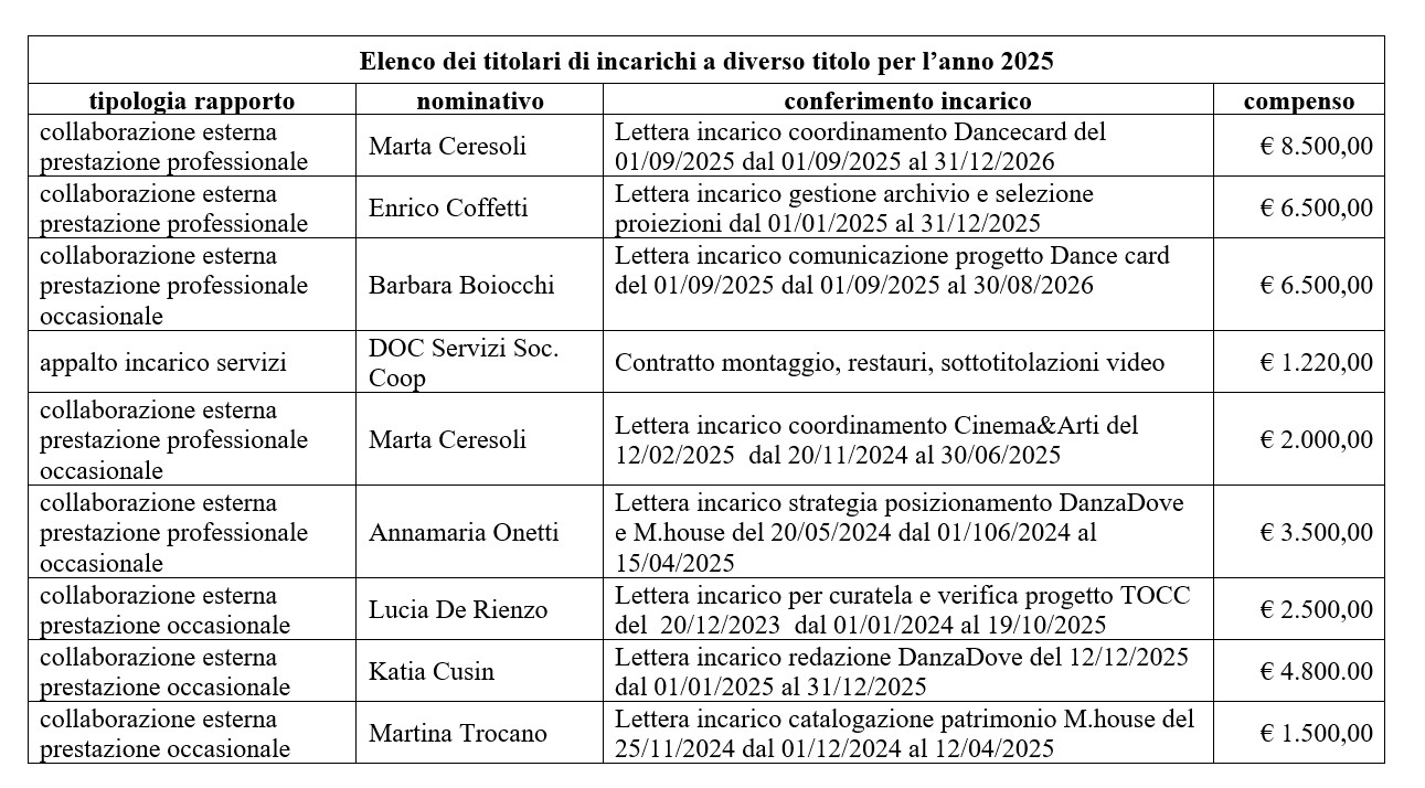 Katia Cusin: responsabile comunicazione, redazione dell’app DanzaDove e comunicazione progetto Dance Card con compenso per l’anno 2022 pari a 4.800 euro lordi.